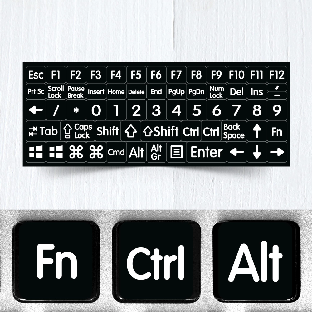 We introduce stickers for keyboards with big function and modifier keys on black backgroun: alt, ctrl, fn, cmd etc. A simple, quick and most inexpensive way to replace (or renew) the existing notebook or laptop, for people who have hard time seeing standard keyboard characters. Ideal for any age group.