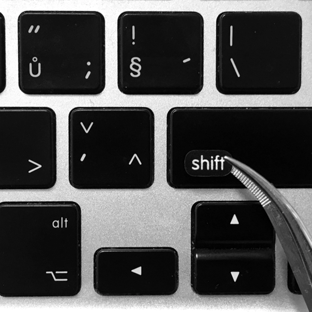 The rectangular shape with rounded corners and compact dimensions (6.5 mm high and 3–5 mm wide depending on the character) allows easy placement in any corner of a key. The stickers are made of high-quality transparent matte vinyl with a strong adhesive and protective coating for long-lasting use. Their ultra-thin design ensures a smooth typing experience and compatibility with backlit keyboards.